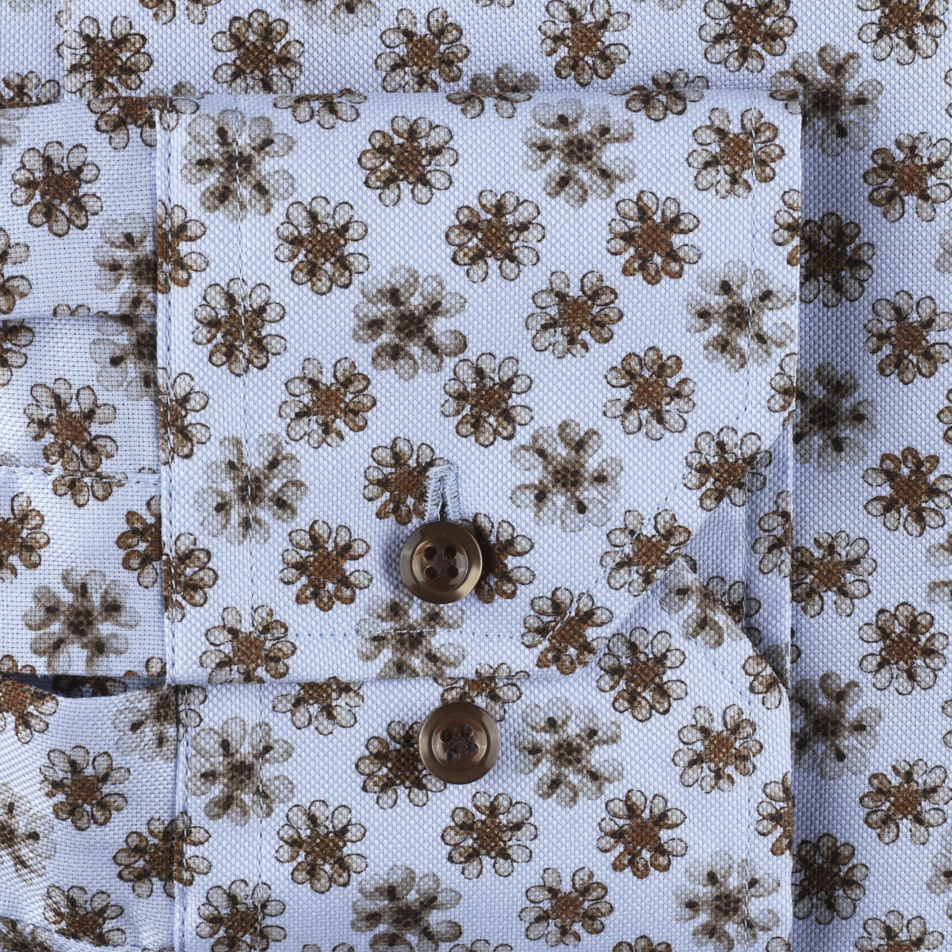 Light blue oxford shirt, in fitted body, made in cotton. Designed with a floral pattern, mother of pearl buttons, single cuffs, and a cutaway collar.